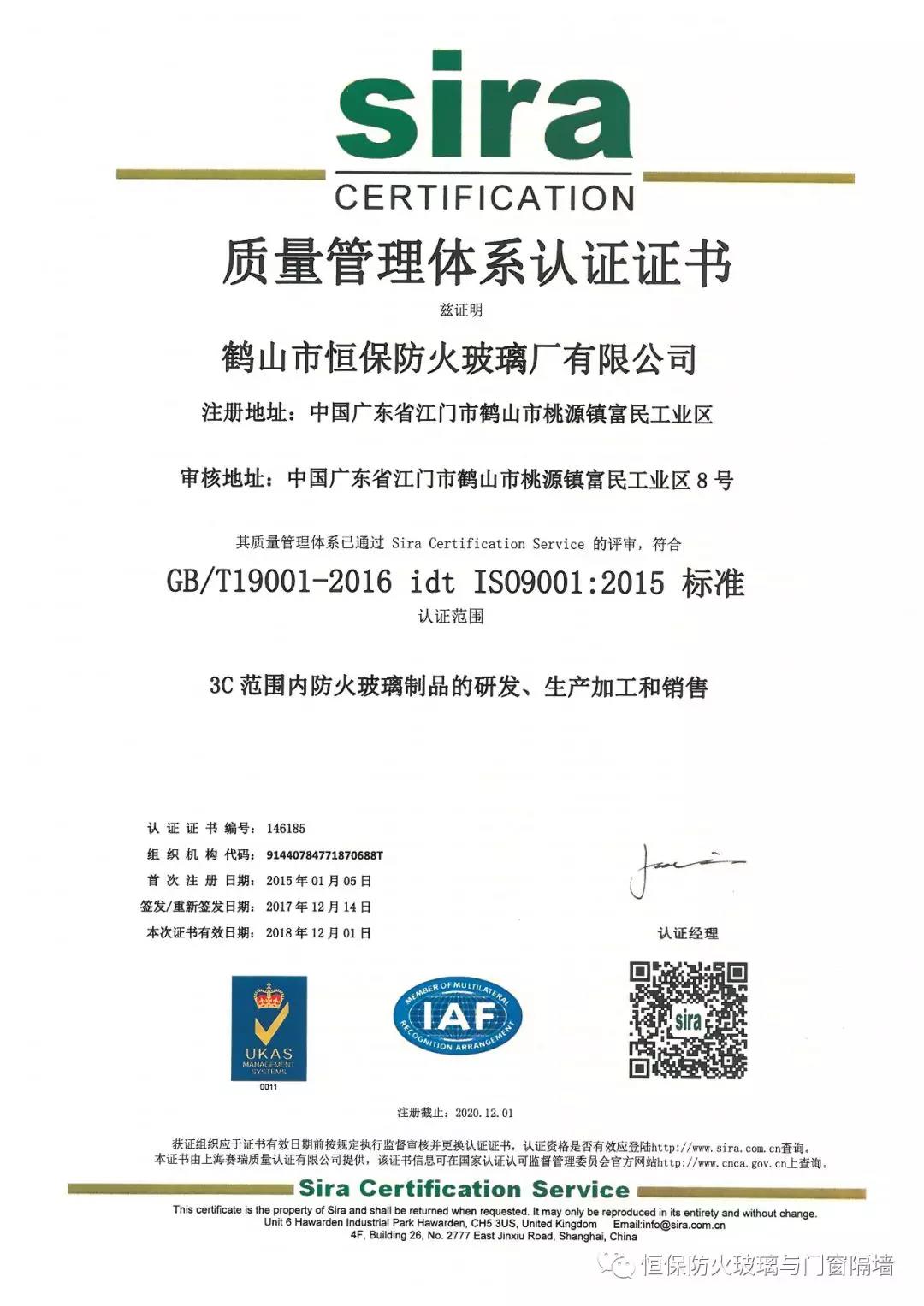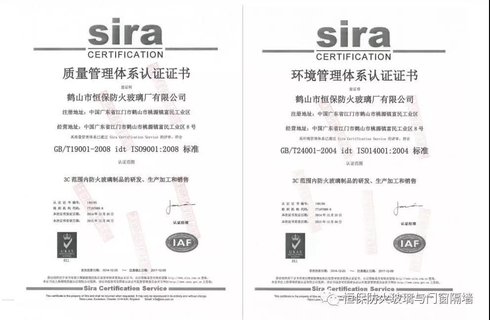鶴山市恒保防火玻璃廠(chǎng)有限公司,自2014年第一次獲得ISO9001-2008質(zhì)量管理體系、ISO14001-2008環(huán)境管理體系認(rèn)證。并與原企業(yè)管理體系相結(jié)合,與CCC強(qiáng)制性認(rèn)證產(chǎn)品企業(yè)管理體系相融合,建立了更完善的科研、開(kāi)發(fā)、生產(chǎn)、銷(xiāo)售和售后服務(wù)體系,使恒保公司穩(wěn)健快速增長(zhǎng)。